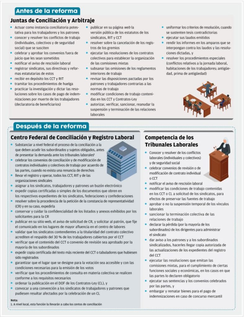 Entre esas variantes, se encuentra la creación a nivel federal y estatal de los tribunales en materia de trabajo y centros de conciliación, así como de un organismo autónomo encargado de realizar el registro de Contratos Colectivos de Trabajo (CCT), sus modificaciones, incluso de los reglamentos interiores de trabajo (RIT).